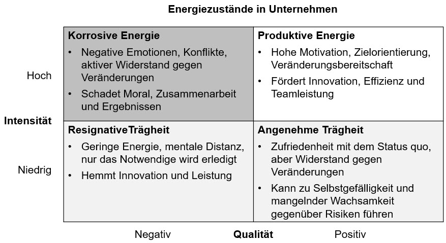 Organisationale Energie manifestiert sich in der Intensität, Geschwindigkeit und Ausdauer von Arbeits-, Veränderungs- und Innovationsprozessen. Es gibt vier Typen von organisationaler Energie, die sich durch unterschiedliche Ausprägungen an Intensität (hoch / niedrig) und Qualität (positiv / negativ) der vorherrschenden Energie unterscheiden (s. Abbildung).